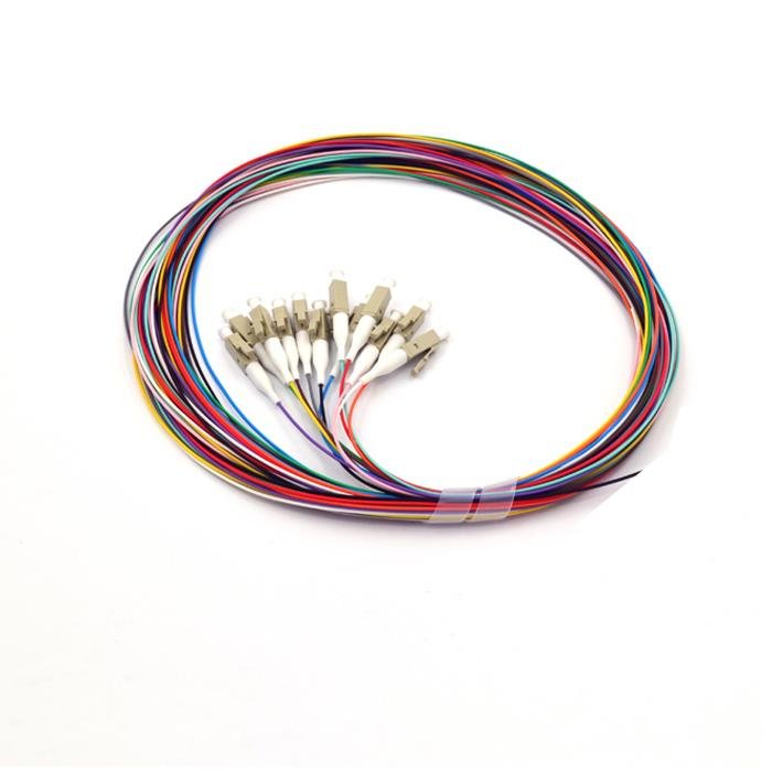 A fiber optic pigtail is a short segment of optical fiber cable (typically 0.5–3 meters, though custom lengths reach 10 meters) that is factory-terminated with a connector on one end only. The opposite end is left bare (250 μm or 900 μm coated fiber) for fusion splicing to a larger distribution or feeder cable.